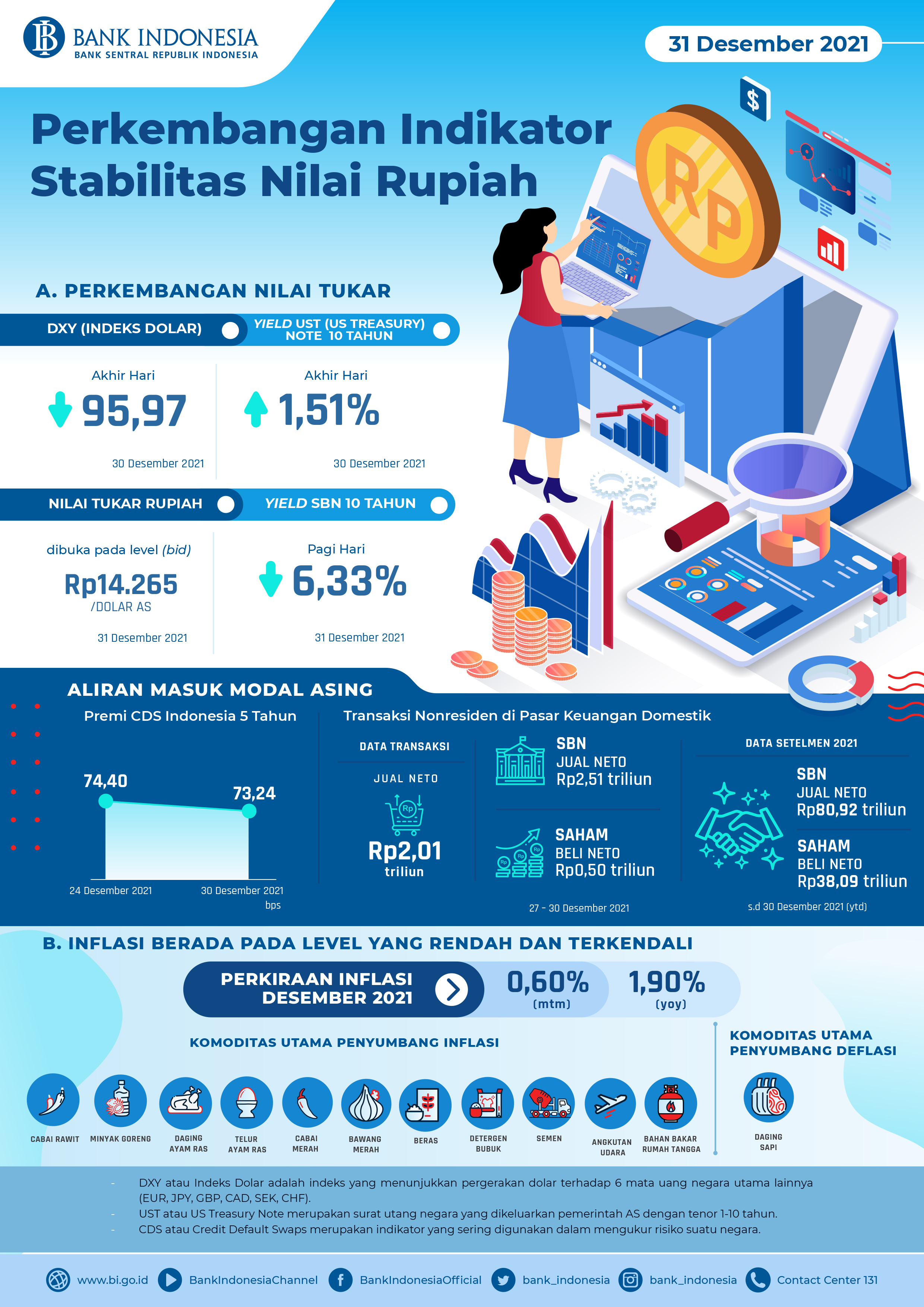 - Berdasarkan data transaksi 27-30 Desember 2021, nonresiden di pasar keuangan domestik jual neto Rp2,01 triliun terdiri dari jual neto di pasar SBN sebesar Rp2,51 triliun dan beli neto di pasar saham sebesar Rp0,50 triliun.