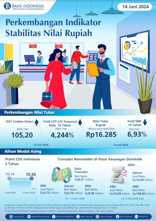 - Berdasarkan data transaksi 10 – 13 Jun 2024, nonresiden tercatat beli neto Rp8,91 triliun terdiri dari jual neto Rp0,75 triliun di pasar SBN, beli neto Rp0,76 triliun di saham, dan beli neto Rp8,90 triliun di pasar Sekuritas Rupiah Bank Indonesia (SRBI).
