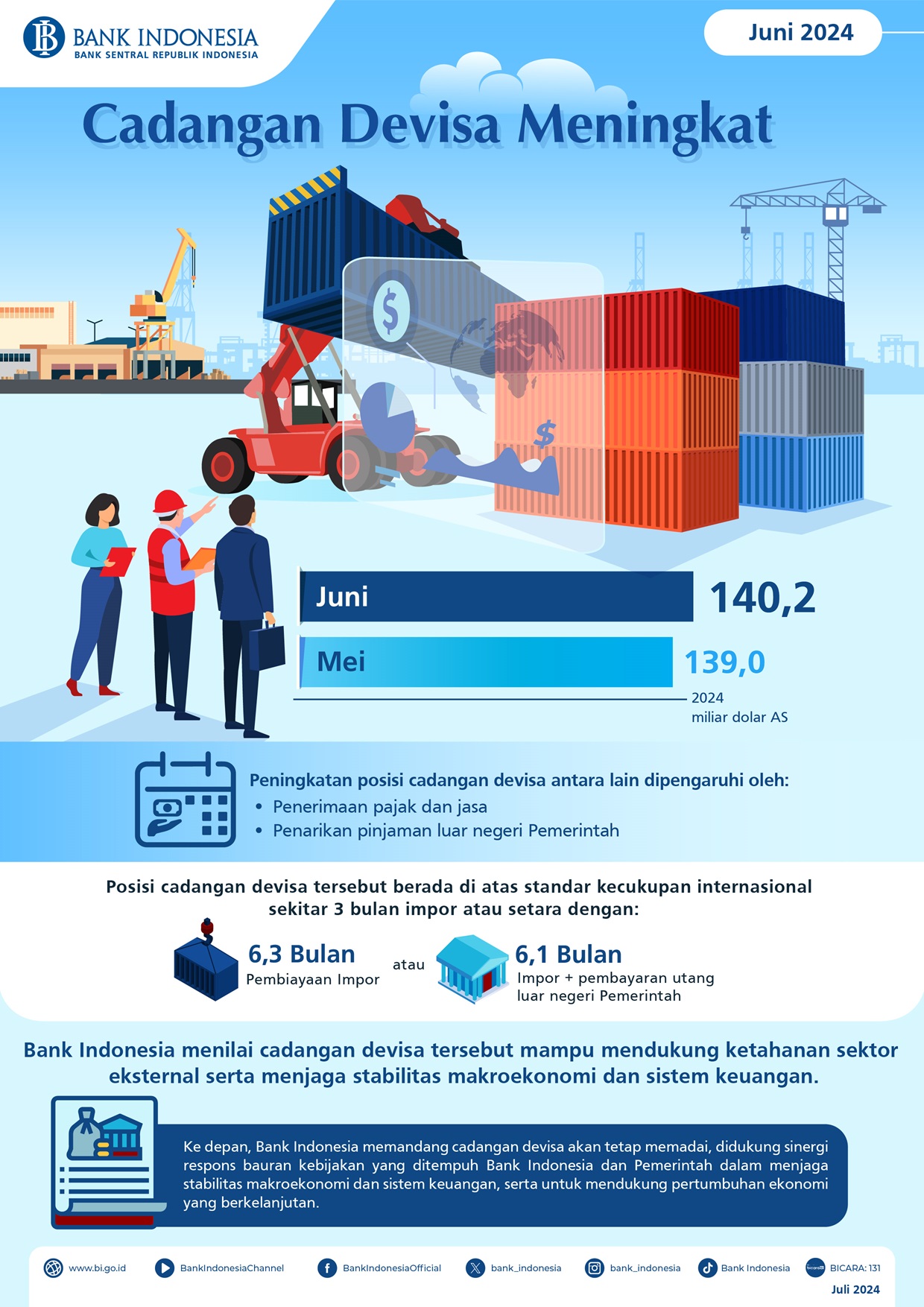 Posisi cadangan devisa Indonesia pada akhir Juni 2024 tercatat sebesar 140,2 miliar dolar AS, meningkat dibandingkan dengan posisi pada akhir Mei 2024 sebesar 139,0 miliar dolar AS. Kenaikan posisi cadangan devisa tersebut dipengaruhi oleh penerimaan pajak dan jasa serta penarikan pinjaman luar negeri pemerintah, di tengah kebutuhan stabilisasi nilai tukar Rupiah sejalan dengan masih tingginya ketidakpastian pasar keuangan global. Posisi cadangan devisa pada akhir Juni 2024 setara dengan pembiayaan 6,3 bulan impor atau 6,1 bulan impor dan pembayaran utang luar negeri pemerintah, serta berada di atas standar kecukupan internasional sekitar 3 bulan impor. Bank Indonesia menilai cadangan devisa tersebut mampu mendukung ketahanan sektor eksternal serta menjaga stabilitas makroekonomi dan sistem keuangan.