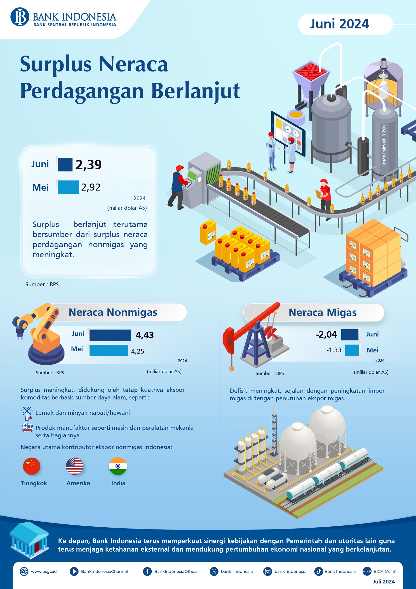 Berdasarkan data Badan Pusat Statistik (BPS), surplus neraca perdagangan Indonesia pada Juni 2024 sebesar 2,39 miliar dolar AS, lebih rendah dibandingkan dengan surplus pada Mei 2024 sebesar 2,92 miliar dolar AS. Bank Indonesia memandang surplus neraca perdagangan ini positif untuk menopang ketahanan eksternal perekonomian Indonesia lebih lanjut. Ke depan, Bank Indonesia terus memperkuat sinergi kebijakan dengan Pemerintah dan otoritas lain guna terus meningkatkan ketahanan eksternal dan mendukung pertumbuhan ekonomi nasional yang berkelanjutan.