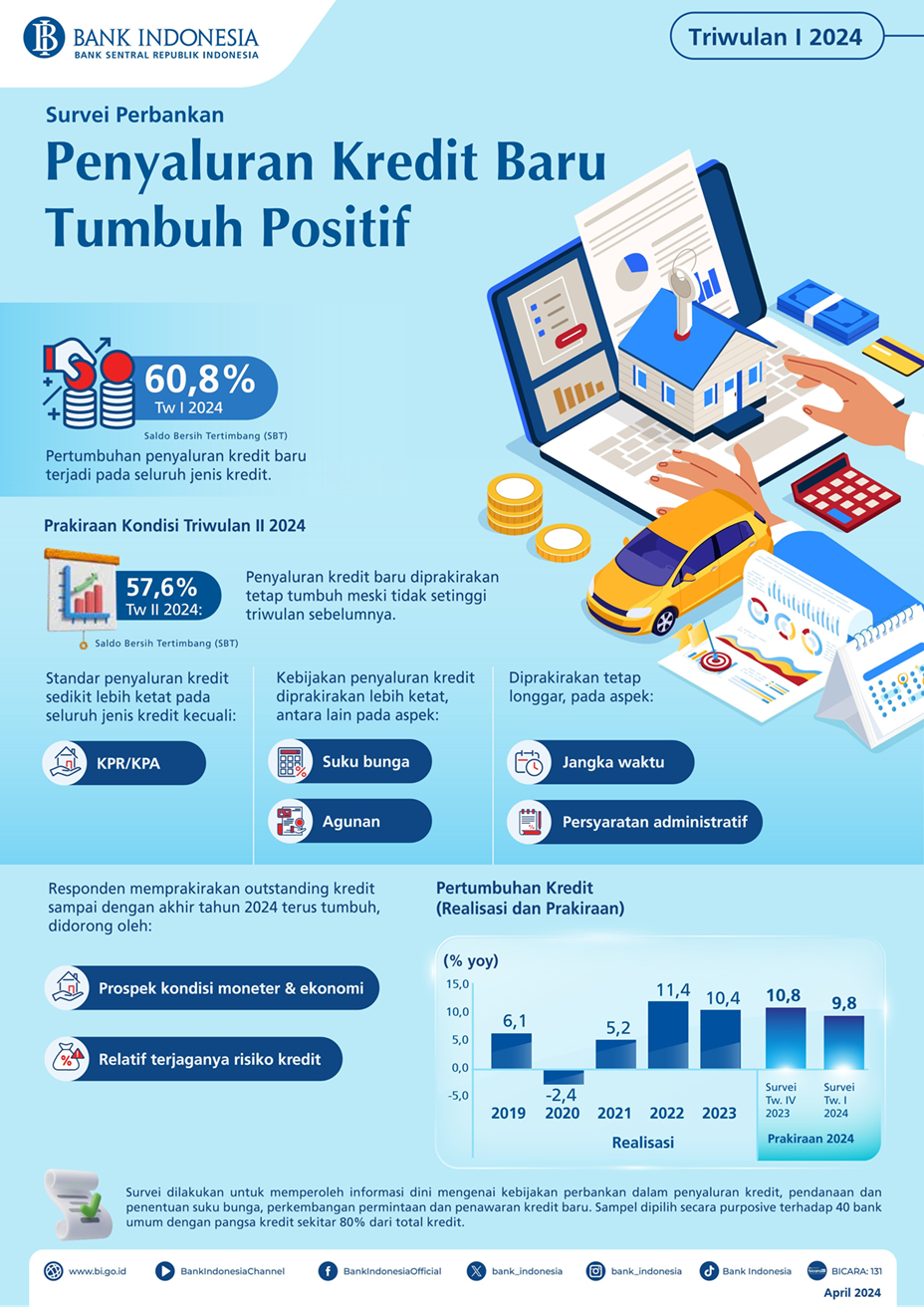 Hasil Survei Perbankan Bank Indonesia mengindikasikan penyaluran kredit baru pada triwulan I 2024 tumbuh positif, meski tidak setinggi triwulan IV 2023 sesuai dengan pola historisnya. Hal ini tecermin dari nilai Saldo Bersih Tertimbang (SBT) penyaluran kredit baru triwulan I 2024 sebesar 60,8%. Pertumbuhan penyaluran kredit baru tersebut terjadi pada seluruh jenis kredit. Selanjutnya, pada triwulan II 2024 penyaluran kredit baru diprakirakan tetap tumbuh dengan SBT prakiraan penyaluran kredit baru sebesar 57,6%.