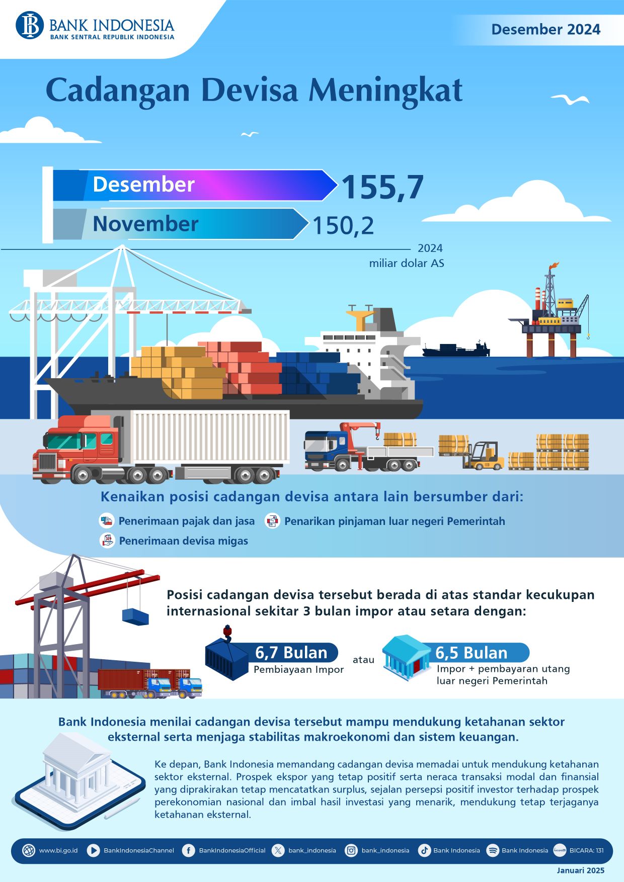Posisi cadangan devisa Indonesia pada akhir Desember 2024 tercatat sebesar 155,7 miliar dolar AS, meningkat dibandingkan posisi pada akhir November 2024 sebesar 150,2 miliar dolar AS. Kenaikan posisi cadangan devisa tersebut antara lain bersumber dari penerimaan pajak dan jasa,  penarikan pinjaman luar negeri pemerintah, serta penerimaan devisa migas, di tengah kebijakan stabilisasi nilai tukar Rupiah sejalan dengan peningkatan ketidakpastian pasar keuangan global. Posisi cadangan devisa pada akhir Desember 2024 setara dengan pembiayaan 6,7 bulan impor atau 6,5 bulan impor dan pembayaran utang luar negeri pemerintah, serta berada di atas standar kecukupan internasional sekitar 3 bulan impor. Bank Indonesia menilai cadangan devisa tersebut mampu mendukung ketahanan sektor eksternal serta menjaga stabilitas makroekonomi dan sistem keuangan.
