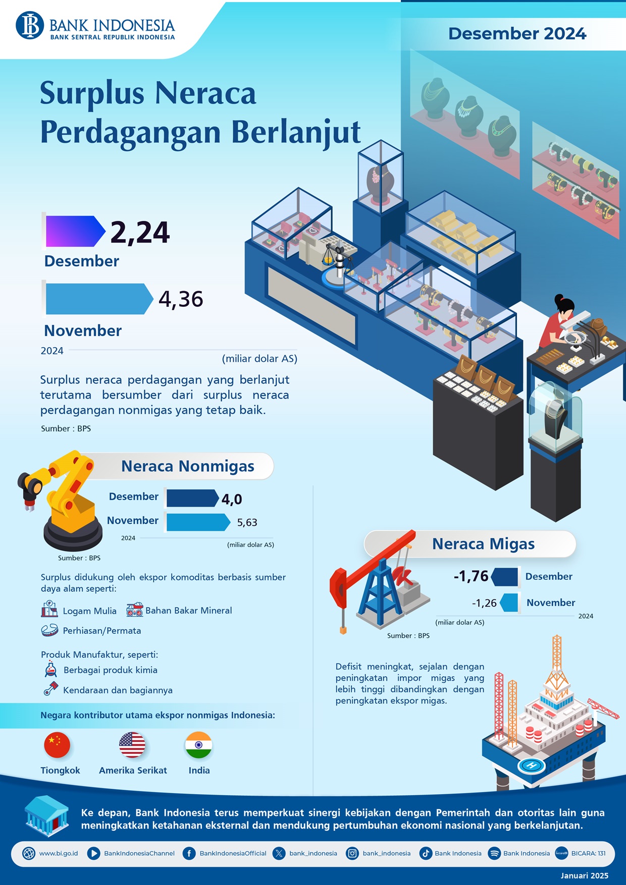 Berdasarkan data Badan Pusat Statistik (BPS), surplus neraca perdagangan Indonesia pada Desember 2024 mencapai 2,24 miliar dolar AS, melanjutkan capaian surplus pada November 2024 sebesar 4,37 miliar dolar AS. Dengan perkembangan tersebut, neraca perdagangan Indonesia pada 2024 mencatat surplus 31,04 miliar dolar AS, setelah sebelumnya mencatat surplus pada 2023 sebesar 36,89 miliar dolar AS. Bank Indonesia memandang surplus neraca perdagangan ini positif untuk menopang ketahanan eksternal perekonomian Indonesia lebih lanjut. Ke depan, Bank Indonesia terus memperkuat sinergi kebijakan dengan Pemerintah dan otoritas lain guna meningkatkan ketahanan eksternal dan mendukung pertumbuhan ekonomi nasional yang berkelanjutan.