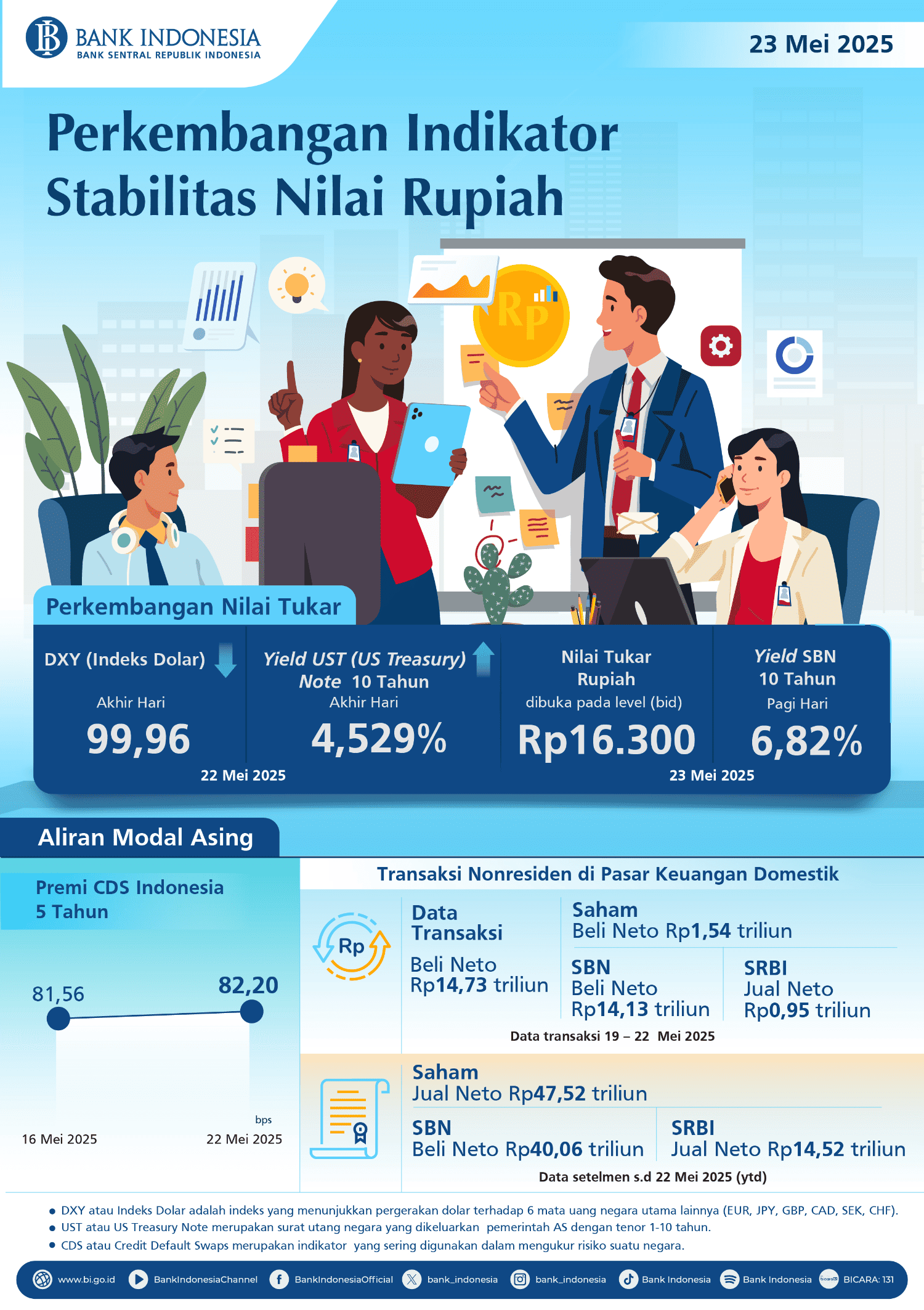 - Berdasarkan data transaksi 19 - 22 Mei 2025, secara agregat nonresiden tercatat beli neto sebesar Rp14,73 triliun, terdiri dari beli neto sebesar Rp1,54 triliun di pasar saham dan sebesar Rp14,13 triliun di pasar SBN, serta jual neto sebesar Rp0,95 triliun di Sekuritas Rupiah Bank Indonesia (SRBI).
