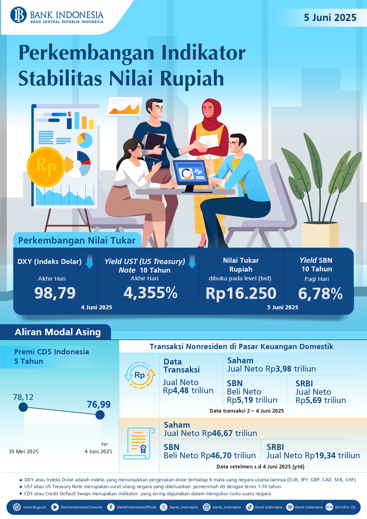 - Berdasarkan data transaksi 2 – 4 Juni 2025, nonresiden tercatat jual neto sebesar Rp4,48 triliun, terdiri dari jual neto sebesar Rp3,98 triliun di pasar saham dan Rp5,69 triliun di Sekuritas Rupiah Bank Indonesia (SRBI) serta beli neto sebesar Rp5,19 triliun di pasar SBN.