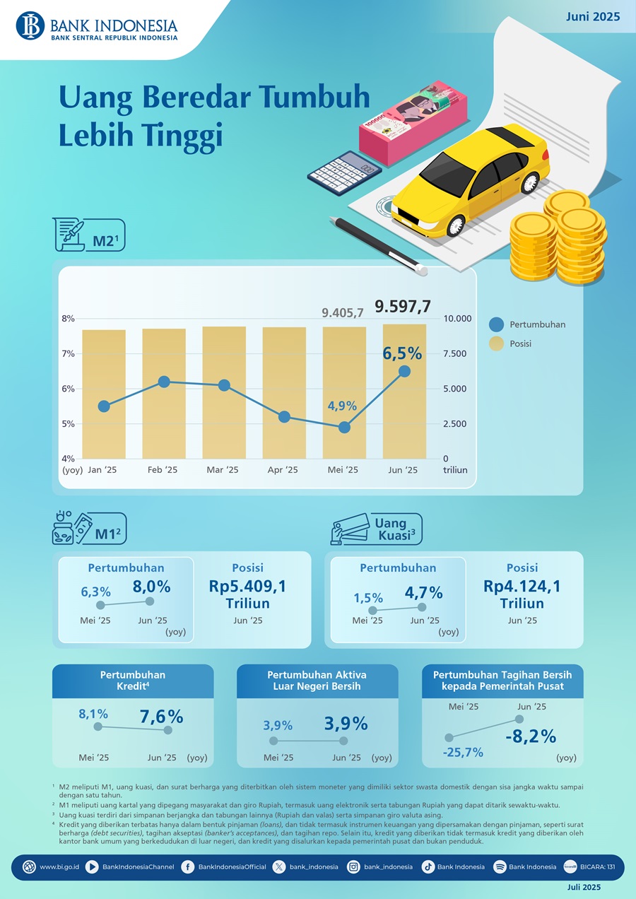 No. 27/159/DKom Likuiditas perekonomian atau uang beredar dalam arti luas (M2) pada Juni 2025 tumbuh lebih tinggi. Pertumbuhan M2 pada Juni 2025 sebesar 6,5% (yoy), lebih tinggi dibandingkan pertumbuhan Mei 2025 sebesar 4,9% (yoy) sehingga tercatat Rp9.597,7 triliun. Perkembangan tersebut didorong oleh pertumbuhan uang beredar sempit (M1) sebesar 8,0% (yoy) dan uang kuasi sebesar 4,7% (yoy).