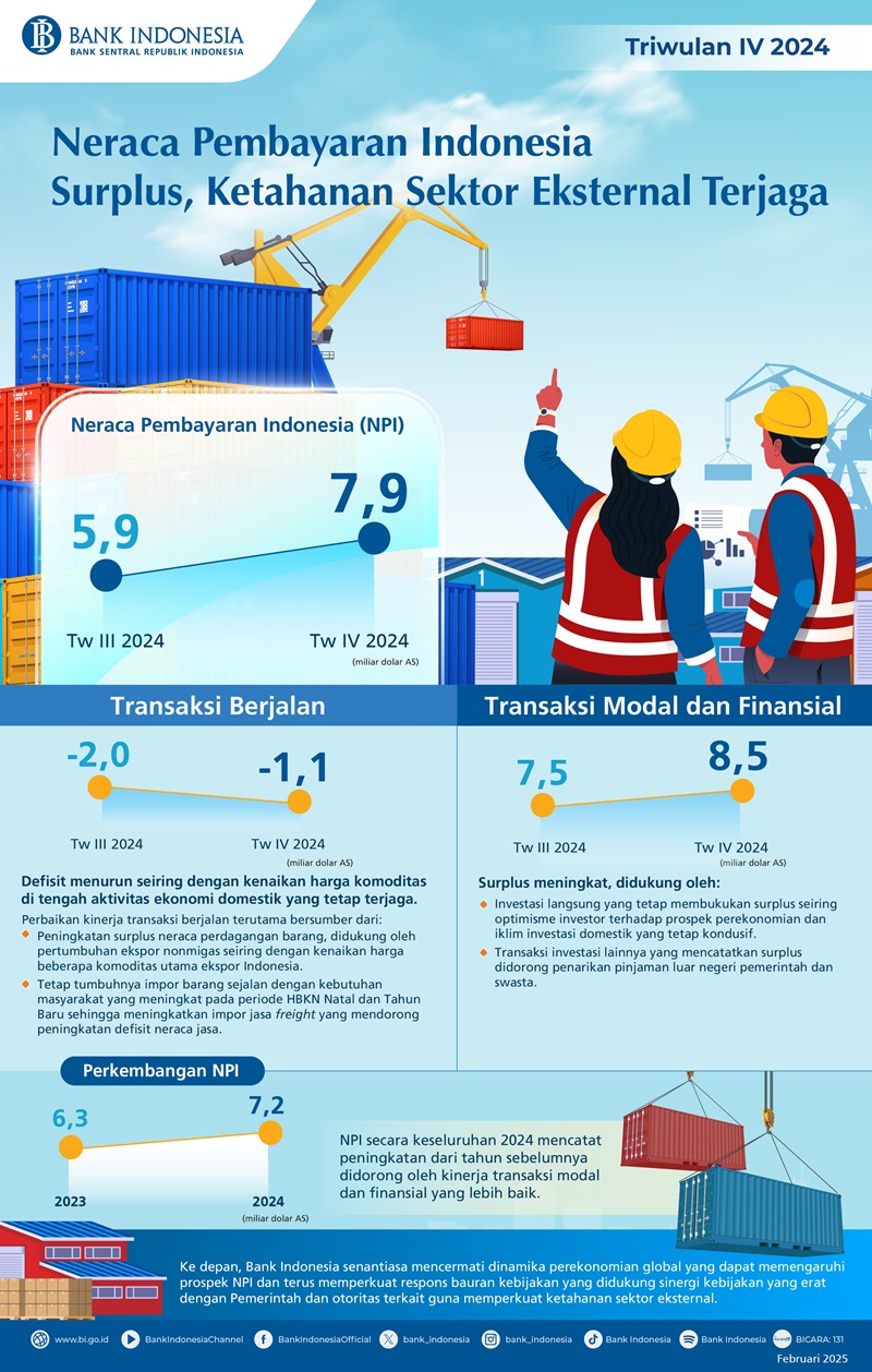Kinerja Neraca Pembayaran Indonesia (NPI) pada triwulan IV 2024 meningkat dibandingkan triwulan III 2024, sehingga menopang ketahanan eksternal. NPI pada triwulan IV 2024 mencatat surplus sebesar 7,9 miliar dolar AS, meningkat dibandingkan dengan surplus triwulan sebelumnya sebesar 5,9 miliar dolar AS. Kenaikan surplus NPI tersebut ditopang oleh surplus transaksi modal dan finansial yang meningkat serta defisit transaksi berjalan yang lebih rendah.